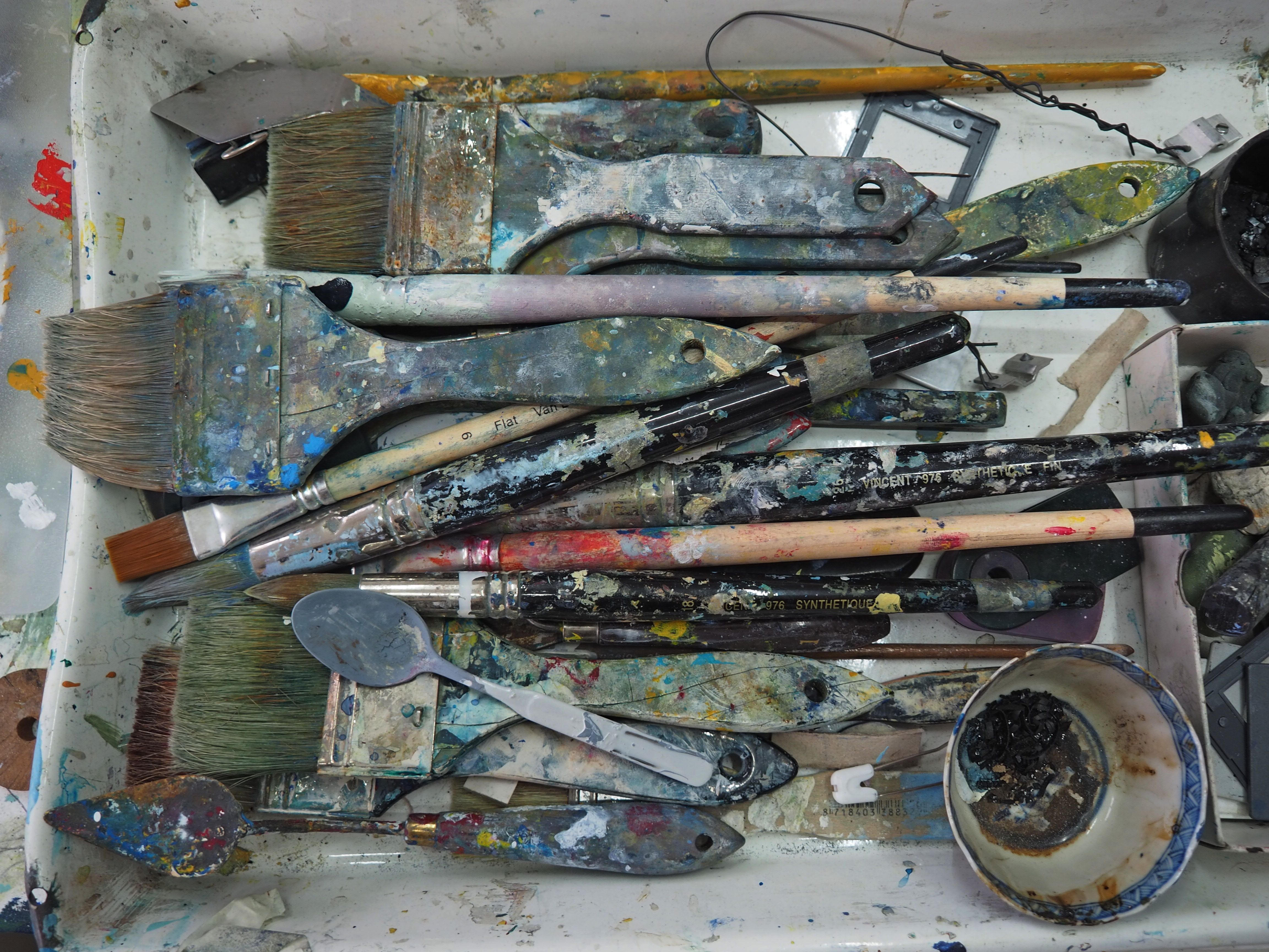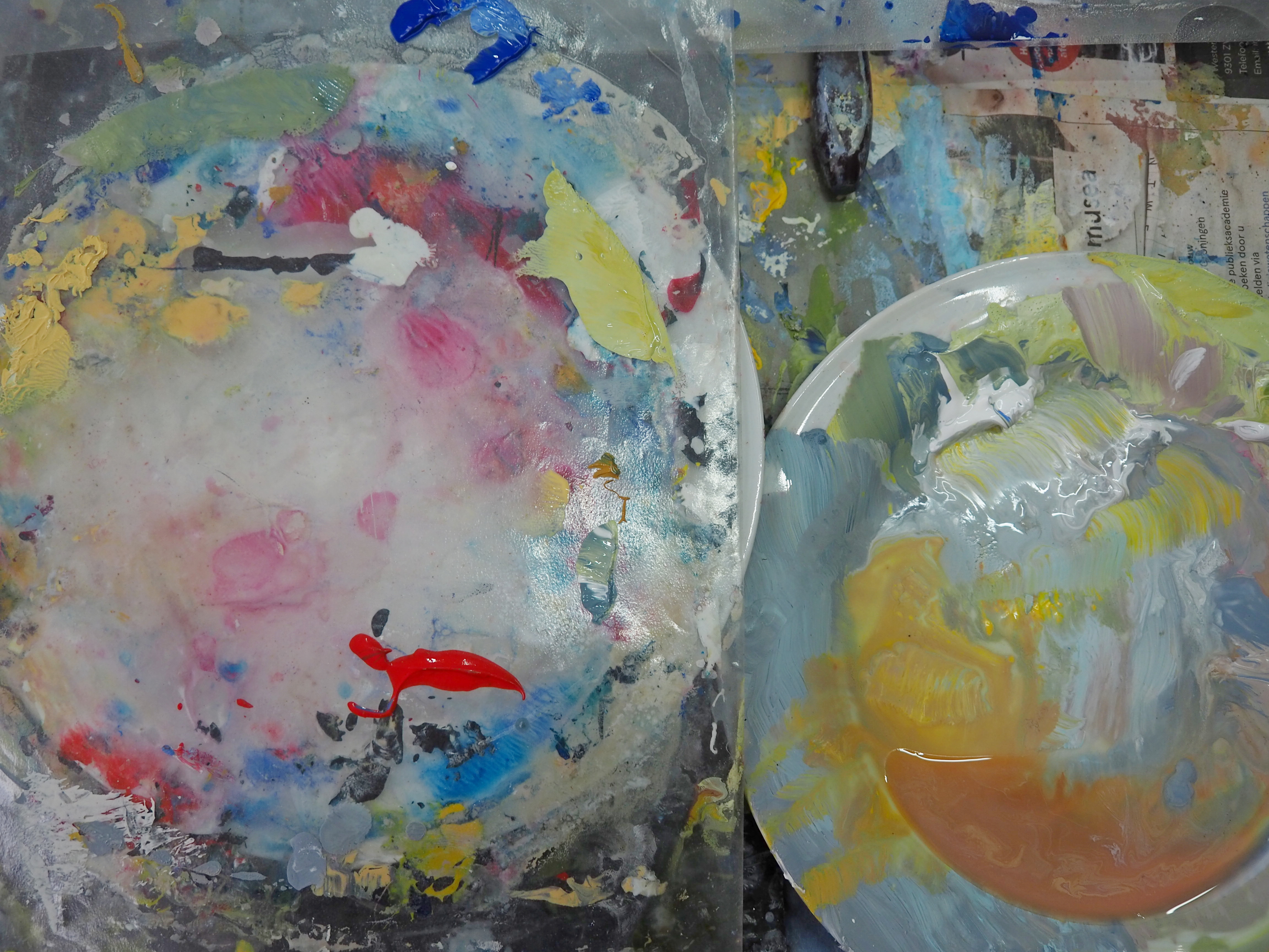 2026 begon geweldig met sneeuw en veel zon. Voor mij een stimulans om erop uit te trekken met mijn camera en ook in mijn atelier te werken waar de zon bijna de hele dag naar binnen schijnt. Hieronder zie je mijn werktafels met de verschillende materialen. Mijn paletten onder plastic zodat de verf niet uitdroogt. Mijn schildergereedschap: brede, varkens haren spalter en dikke penselen. Wees welkom om eens een kijkje te nemen hier. Het ziet er anders uit dan tijdens het, opgeruimde, Rondje Meer!
