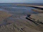 Het slibrijke water trekt zich traag en stroperig terug. Na een gortdroge zomer valt de sliblaag uiteen in porcelein fijne scherven. Montage van 3 foto's